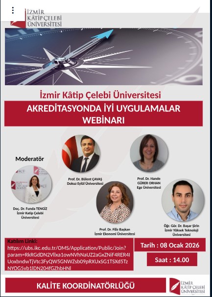 İzmir Kâtip Çelebi Üniversitesi tarafından 08 Ocak 2026 Perşembe günü 14.00–17.00 saatleri arasında çevrim içi olarak düzenlenen “Akreditasyonda İyi Uygulamalar” başlıklı webinar kapsamında, farklı üniversitelerde akreditasyon süreçleri çerçevesinde geliştirilen başarılı uygulamalar katılımcılarla paylaşılmıştır.
